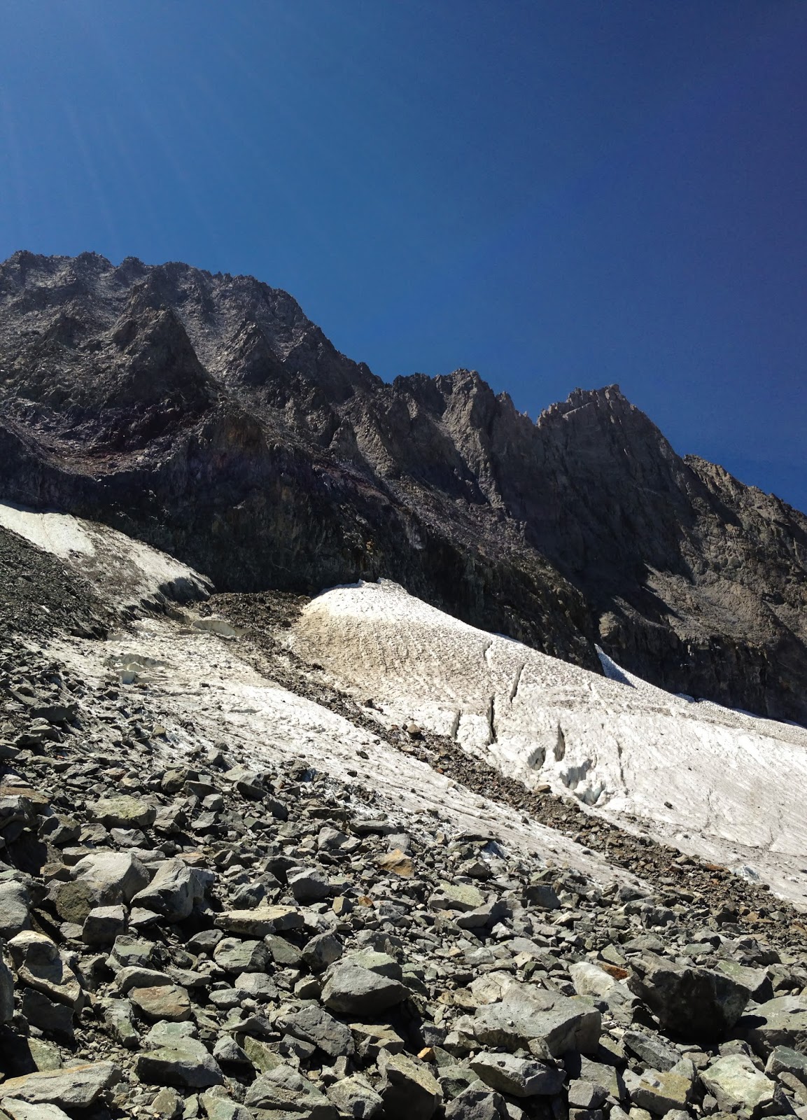 I've had these running withdrawal symptoms before, but I've never been able to pinpoint the causes until this weekend when I went to the Eastern Sierras. As I left the comfort of my car and the man-made world at the trail head, I entered the steep, rough, and challenging world of the Mountaineer's Route. Unlike the Mt. Whitney trail, the Mountaineer's Route is not manmade except for the occasional cairn and small stretch of cleared dirt in the trees. Much of it simply is loose rocks, boulders, or granite slabs. The intimacy of the route is painful at first until the eyes gaze upward at the hulking pillars driving into the sky.